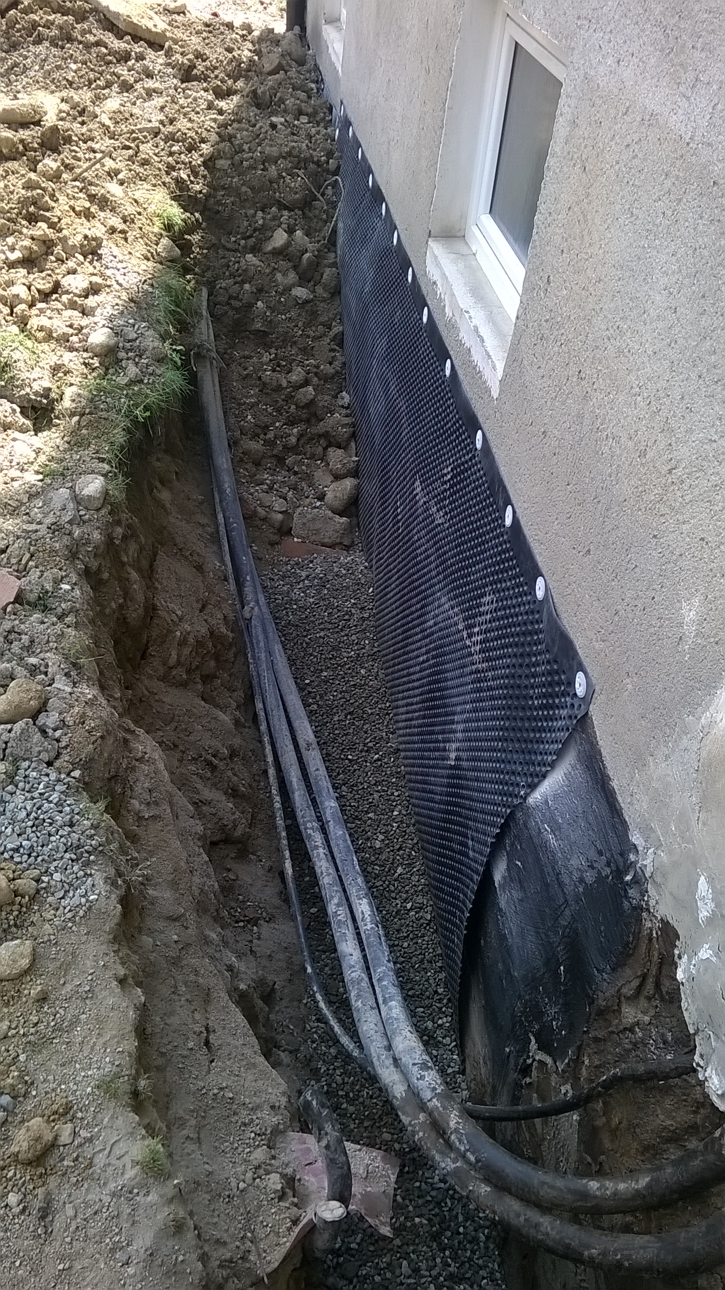 hydroizolácia, odvodnenie základov bytového domu drenážou, realizácia 2014